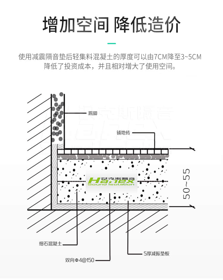 4.性價比優(yōu)勢:超薄材質(zhì)不以犧牲層高為代價來換取減振保溫的綠色達標;柔性材質(zhì)大限度避免裂縫,從而使小成本實現(xiàn)減振、保溫兩全其美。