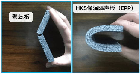 全面可彎曲:XPS、EPS(聚苯板)受力易斷裂,而HKS保溫隔聲板(EPP)可以實現(xiàn)180°彎曲。